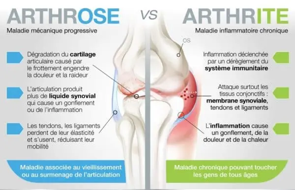 La distinction entre arthrose et arthrite est fondamentale : l’arthrose est dégénérative et peu inflammatoire, l’arthrite est inflammatoire par définition. Le traitement naturopathique cible donc des leviers différents.