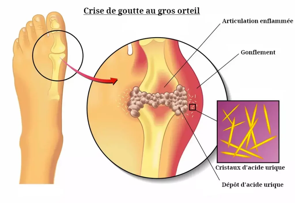 La goutte est une arthrite microcristalline. Elle survient lorsque l’acide urique, présent en excès dans le sang (hyperuricémie), réagit avec le sodium pour former des cristaux d’urate de sodium. Ces cristaux se déposent dans les articulations, irritent le cartilage et déclenchent une crise inflammatoire aiguë : douleur intense, gonflement chaud, fièvre nocturne.